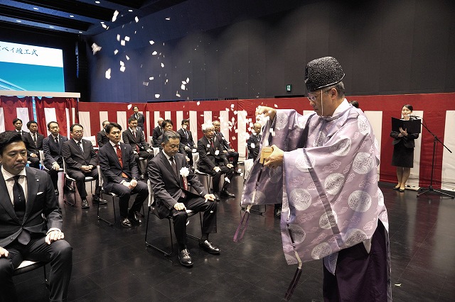 竣工式の神事にはコナミグループの東尾社長のほか、コナミクリエイティブフロント東京ベイで最先端のゲーム開発を担うコナミデジタルエンタテインメント(東京都中央区)の早川英樹社長をはじめとするコナミグループ中核会社の代表や日建設計(東京都千代田区)の大松敦社長、大成建設(東京都新宿区)の相川善郎社長など関係者20人余りが参加した。
