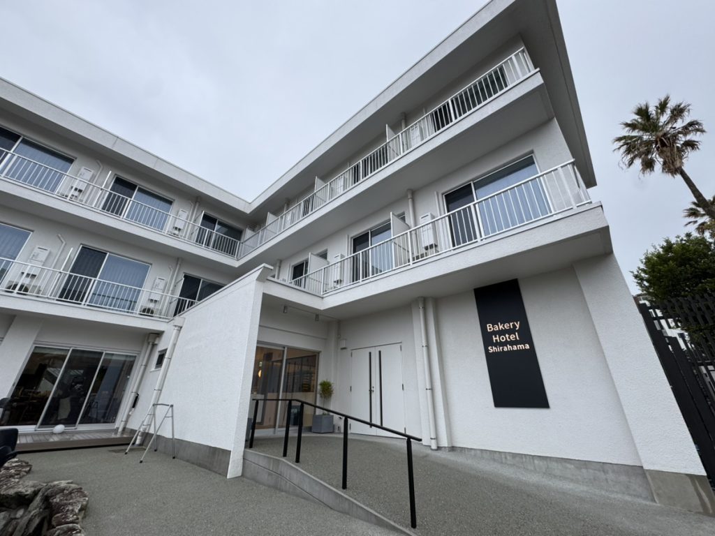 「ベーカリーホテル白浜」は白浜の高台にあります。海辺のアパートをリノベーションし、2024年にオープンしました。青空と海によく映える白い外観は、シンプルながら印象的です。客室は木目調の天井と間接照明が心地よい、洗練されたモダン空間に仕上がっています。館内には宿泊者以外も利用できる「キーベーカリー白浜」があり、焼き立てパンの香ばしい香りがふわりと漂います。