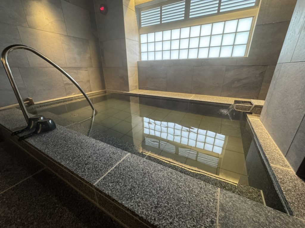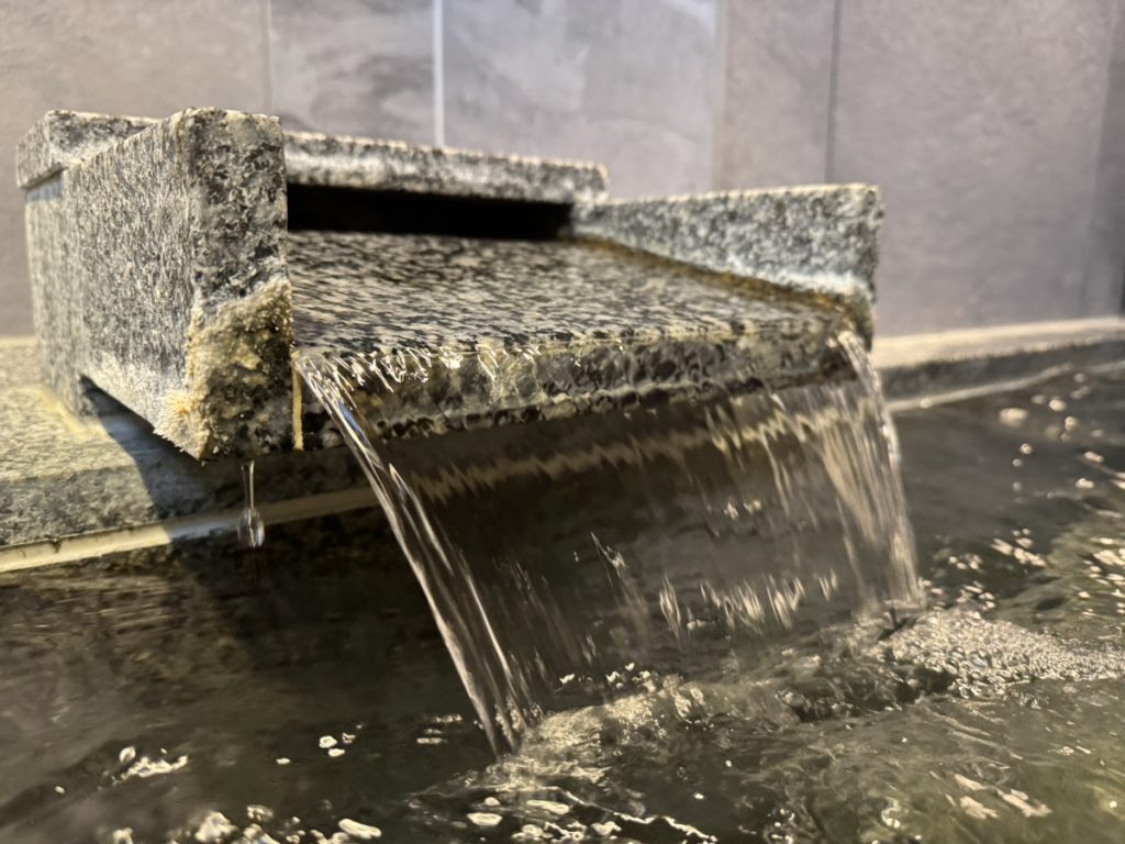 「行幸の湯」と名付けられた浴場は、男女別の内湯のみ。ホテルを出てウッドデッキを歩いた先にある、鍵付きの無人浴場です。チェックイン時に伝えられる暗証番号で入る仕組みで、少し特別感があります。エントランスには10種類のシャンプーがそろったバーが用意されており、入浴前に選ぶ楽しみも。浴室は6〜7人ほどが入れそうな湯船が一つのシンプルな造りで、シックな御影石と石目調タイルが、落ち着いたモダンな雰囲気をつくっています。