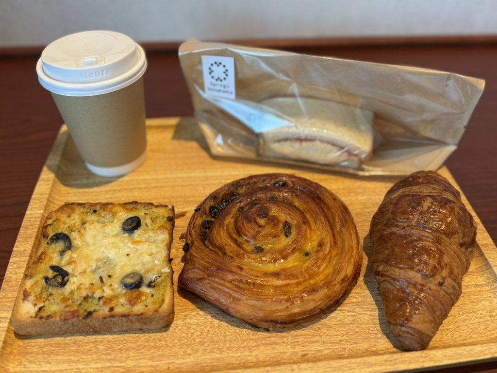 客室を出ると、館内に焼き立てパンの香りが漂い、それだけで朝の気分が上がります。今回はクロワッサン、ハムタマゴサンド、チキンツナマヨとバジルソースのトースト、パン・オ・レザンを購入。香ばしさと生地の風味がしっかり感じられ、気付けば朝から四つも完食してしまいました(お昼用に多めに買ったのに)。温泉旅の朝食といえば和食のイメージがありますが、焼き立てパンで始まる朝もなかなか魅力的です。