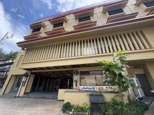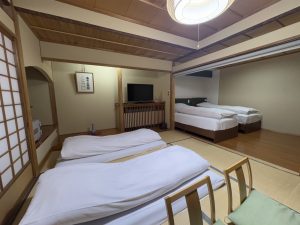 地上4階建ての和モダンな建物は、大規模ホテルのような重厚さを感じさせ、館内の客室は全15部屋とゆったりしたつくりです。宿泊した和洋室は、「和室10畳+洋室ツインベッド+広縁」と広く、ぜいたくにくつろぐことができました。