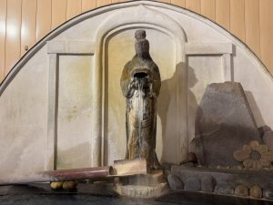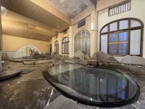 「千人風呂」は、横長の浴室に三つの湯船が並ぶ、広々としたつくりです。レトロなタイルや御影石、地元産の大鉄平石などを使用し、アーチなどの造作が特徴の大正ロマン風。湯口は観音様の石像で、荘厳な雰囲気を放っています。
