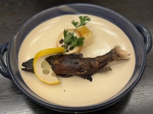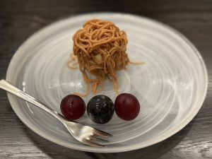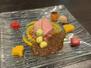 この日のメニューは、シャインマスカットのカナッペに始まり、秋ナスとズワイガニのミルフィーユ、キノコ・アイガモ・イチジクなどの山の幸ガレット、サンマのマリネ、イワナのスモーク、信州サーロインロティ、野沢菜おやき、ナガノパープル(長野県が登録のブドウ)と栗のブラウニーのフルコース。一品ずつ運ばれる料理は、お皿の盛り付けも美しく、季節の食材を色彩含めてじっくり味わうことができました。