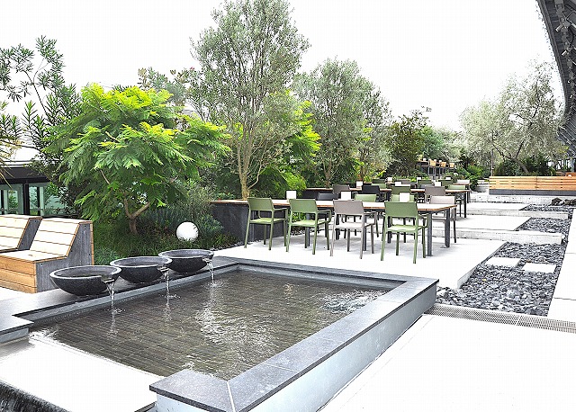 そのシームレス、チェンジャブルな空間は、発想の異なる多様なクリエーターの偶発的な出会いを促進する、全階を高低差の少ない緩やかな楕円状のらせん通路で移動できる工夫や、明るい日差しが差し込む天窓まで吹き抜けになっている中央部の各フロアを見渡せる視界の広さ、リラックスしながらアイデアを深められそうな緑豊かな「屋上庭園」、大きなガラス越しに海を望みながら食事ができる開放的なダイニングなどで表現している。