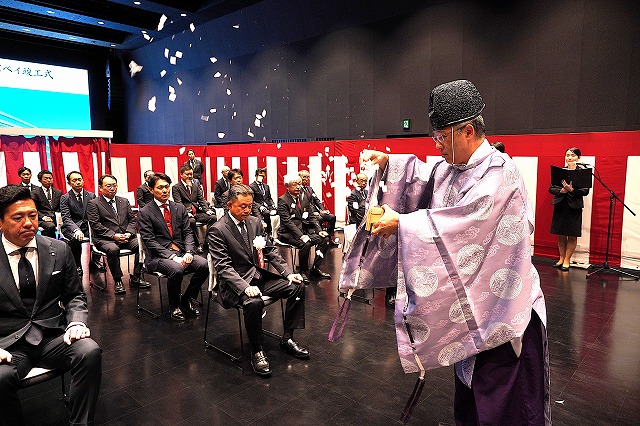 竣工式の神事にはコナミグループの東尾社長のほか、コナミクリエイティブフロント東京ベイで最先端のゲーム開発を担うコナミデジタルエンタテインメント(東京都中央区)の早川英樹社長をはじめとするコナミグループ中核会社の代表や日建設計(東京都千代田区)の大松敦社長、大成建設(東京都新宿区)の相川善郎社長など関係者20人余りが参加した。
