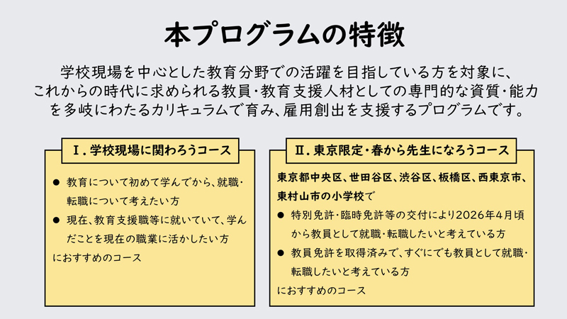 また、自治体と連携した「春から先生になろうコース」も新設された。講義や実習を経て、教員免許を有する者は修了後、地域の学校でそのまま教員として勤務できる。一方、教員免許を持たない者も、特別免許・臨時免許の交付を受けることで教員として働ける仕組みとなっている。大学と自治体が一体となり、教育人材の育成から採用までをワンストップで支援する。