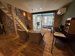 今回宿泊したのは、シックで落ち着いた世界観が特徴の「サファリブラック」。1階にはリビング・ダイニング、展望テラス、半露天風呂。2階にはゆったり過ごせるアウトドアリビングとベッドルームという2階建て構造で、「大人の隠れ家」感が漂う空間でした。