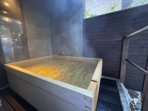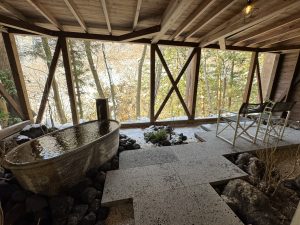 「サファリブラック」の半露天風呂は、香り高いヒノキの角型湯船。まだ新しく、湯気とともにヒノキのやわらかな香りがふわりと立ち上り、四万川のせせらぎが響き、目の前には景勝スポット「楓仙峡(ふうせんきょう)」、山の木々の香りを含んだ風が心地よく吹き抜けていました。