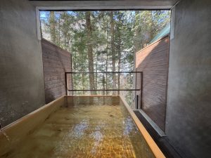 湯船には、正真正銘の四万の源泉が、加水・加温・循環・消毒無しの完全掛け流しで注がれています。泉質は、カルシウム・ナトリウム-硫酸塩泉。無色透明のお湯からは、鮮度の良い甘くきりっとした香りが漂い、豊富なミネラルを感じます。温泉にゆったりつかっていると、なめらかにやさしく包み込んでくれるような浴感。周囲を森に囲まれ、他に誰もいない凛(りん)とした空気の中、時間を忘れて湯あみを堪能することができました。
