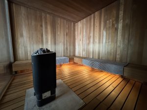 敷地内にある「森のサウナ」は、1人3300円で2時間貸し切り利用が可能。外気浴スペースには、四万の湧き水を掛け流した水風呂が設置されています。