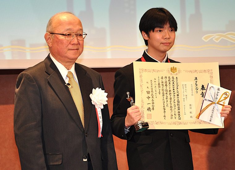準グランプリに輝いた市川高3年の那須航さん(右)。左は日本政策金融公庫の田中一穂総裁=東京都文京区の東京大伊藤国際学術研究センター 伊藤謝恩ホール、2026年1月11日