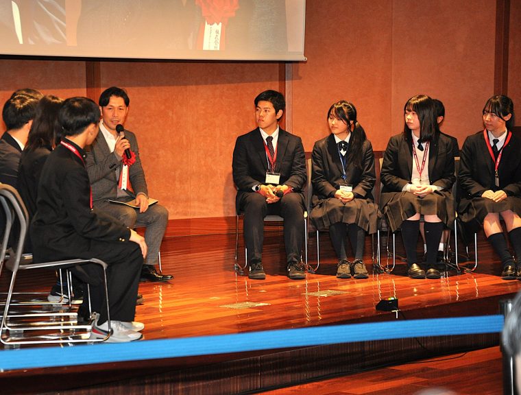 起業を目指す高校生の質問に答えるMagic Shields CEOの下村明司さん(左奥のマイクを持つ男性)