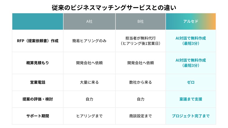 多くのビジネスマッチングサービスが存在する中で、「アルセド」はビジネスモデルそのものを見直すことで、発注者にとっての「納得感」と「効率」を追求したという。発注者視点で開発会社の選定や見積もりの精査を行うことで、「営業電話への対応」や「相見積もりの比較検討」といった煩雑なプロセスを削減。プロのサポートを受けながら、納得のいく発注先選びに専念することができる。