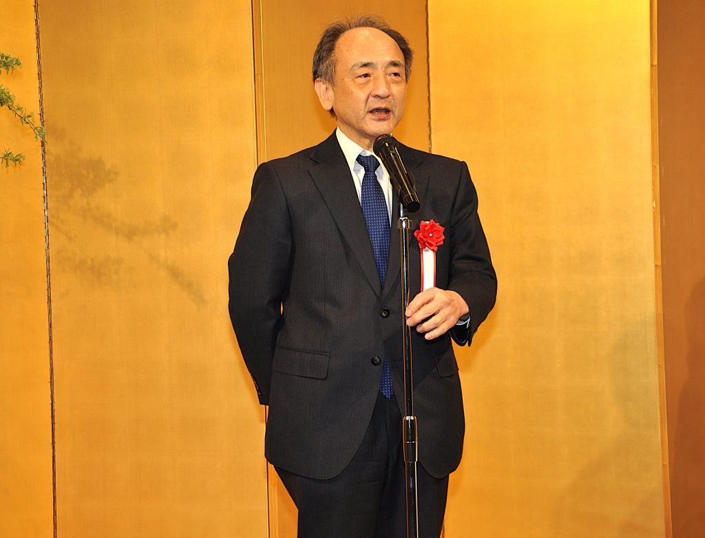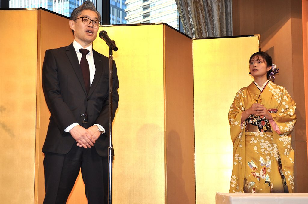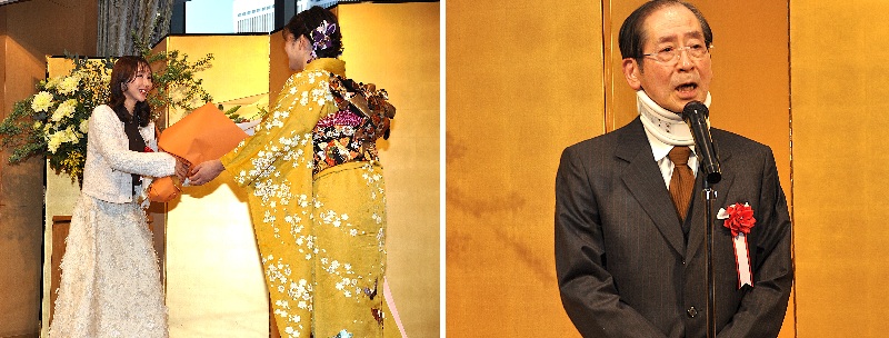 就位式後は祝賀パーティーに移り、JA共済連の細川雅史調査広報部長が「引き続き素晴らしい対局を見せていただきたい」とあいさつし、乾杯の音頭を取った。ファンらはあでやかな着物姿の藤沢女流本因坊との歓談を楽しんだ。