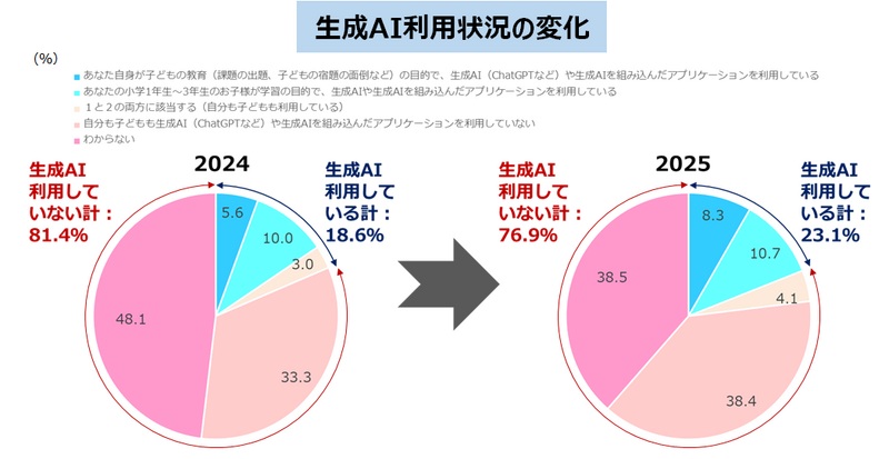 デジタル端末を通じて行うデジタル学習について、頻度は「週5日」が20.1%と最も多く、「毎日」が17.0%あった。学習時間の長さも増加傾向にあった。家庭学習における生成AIの利用状況を聞いたところ「保護者が子どもの教育目的で利用」が8.3%、「子どもが学習の目的で利用」が10.7%、「保護者と子ども両方が利用」が4.1%と、合わせて23.1%となり、前回より4.5ポイント増加した。