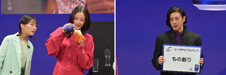 (写真左から)プレモルを専用グラスに注ぐ広瀬すずさん(右)と、心配そうにのぞきこむ伊藤沙莉さん。 オダギリジョーさんは「ゆったりした時間に楽しみたいこと」の質問に「もの創り」を挙げた