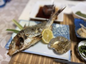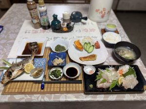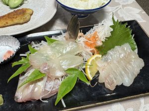 この日の夕食に並んだのは、メバルとカワハギのお造り、カワハギの肝醤油(きもじょうゆ)、地元で「アメ」と呼ばれる魚の塩焼き、ハンタの揚げ物、煮魚、コチとエソの三杯酢、コチのあら汁など。刺身はみずみずしく、カワハギは肝醤油をまとわせることで、ぐっとうまみの厚みが増し、思わず箸が進みます。塩焼きはふっくらと焼き上がり、揚げ物はさくっと軽やか。あら汁には魚の濃厚なだしが溶け込み、最後の一口までしみじみとおいしい。刺身、焼き物、揚げ物、汁物と、地魚の魅力をさまざまなかたちで味わえる、魚好きにはたまらない夕食でした。