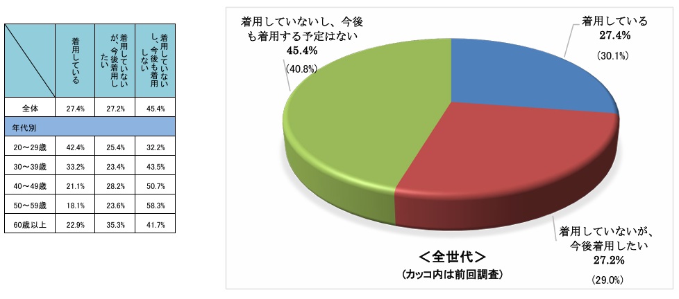 2023年4月にヘルメット着用が努力義務化されてから約3年が経過したが、今回の調査での着用率は全体の27.4%。前回(30.1%)からわずかに減少した。年代別では、自転車利用頻度の高い20代が42.4%と比較的高い一方、50代では18.1%にとどまった。また、全体の45.4%が「着用していないし、今後も着用する予定はない」と回答しており、同社は引き続き周知・啓発の必要性が大きいととらえている。